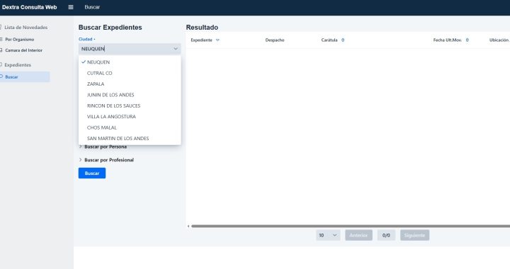 Ingresado el código, se accede a la consulta web donde se pueden buscar los expedientes. Debe hacerse click en el casillero ubicado debajo de “Ciudad” y seleccionar la localidad dónde se tramita el proceso (donde está radicado el trámite y no donde reside el usuario) del menú desplegable. Debajo, en “Aplicación” debe elegirse el fuero (civil o laboral). Debajo puede buscarse el expediente por número, carátula, persona o por profesional.